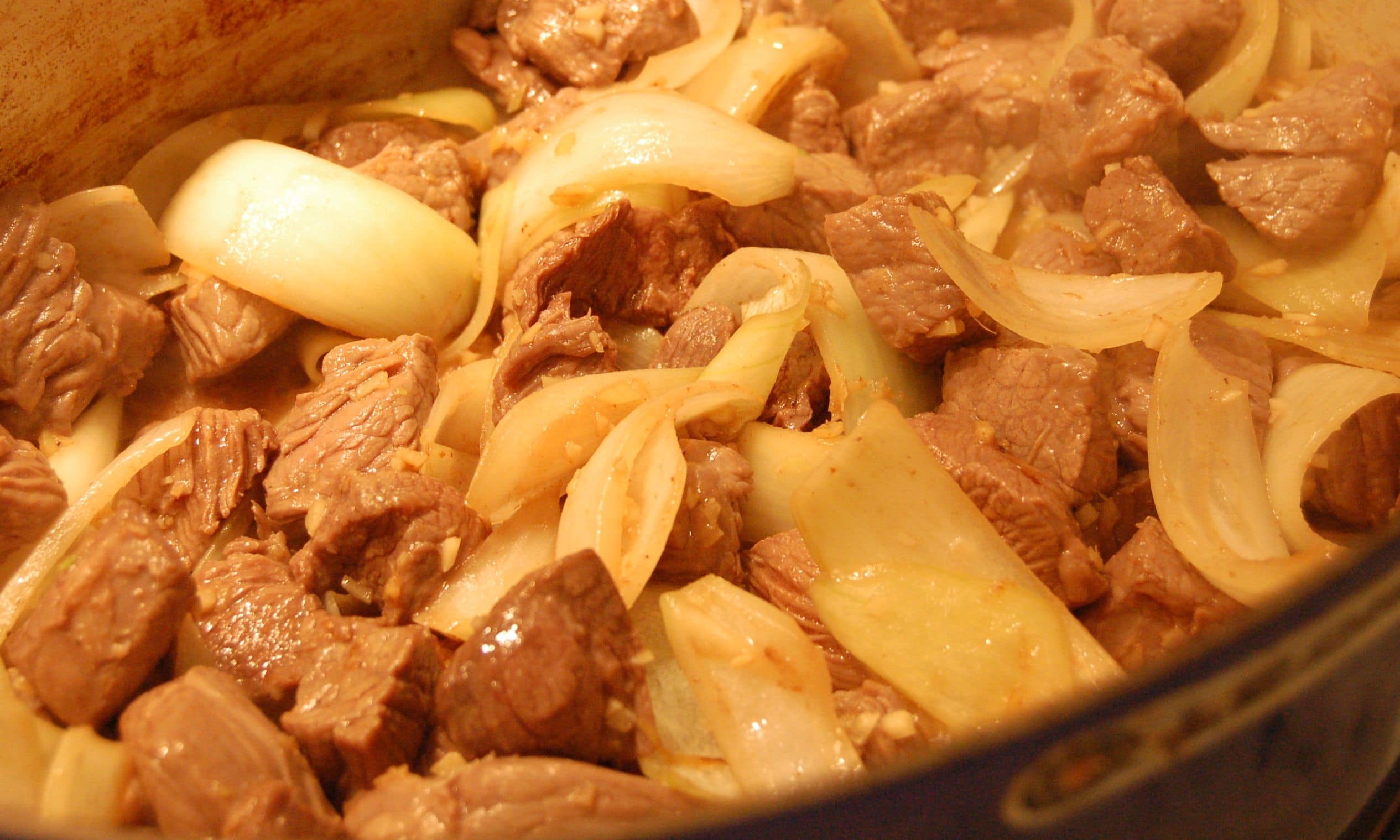 - Warm the remaining tablespoon of oil over medium-high heat. When oil is hot, add onion and saute about 5 minutes. Add the garlic and ginger and saute another 3 minutes. Add the browned beef and drippings.